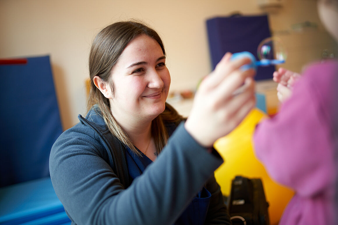 Zum Beispiel leuchtende Kinderaugen. Du arbeitetest zwar im Team, aber ganz anders als im Krankenhaus. Statt auf einer Station hin- und her zu flitzen und für viele Patientinnen und Patienten zuständig zu sein, haben wir einen ganz anderen Personalschlüssel. Du bist ganz intensiv für ein Kind zuständig. Das ist super schön, denn durch diese Bindung wird die Pflege zu etwas ganz Besonderem.